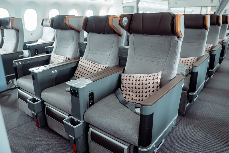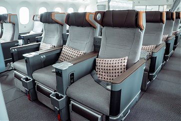 Die neue Premium Economy Class verfügt über 28 Sitze, die in einer 2-3-2-Konfiguration angeordnet sind. Mit dem Wiege-Neigungsmechanismus kann das Sitzkissen gleichzeitig nach vorne und nach oben gleiten. Dadurch wird eine bequeme Neigung von 8 Zoll (20cm) erreicht, während der Platz für den Passagier dahinter erhalten bleibt. Jeder Sitz ist zudem mit einem 15,6-Zoll-Breitbildmonitor samt Unterhaltungssystem sowie kombinierte 110-V-Wechselstrom- und USB-Steckdosen ausgestattet.
