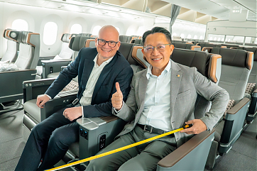 EVA Air setzt neue Maßstäbe mit der vierten Generation ihrer Premium Economy Class-Sitze, die mit einem branchenweit führenden Sitzabstand von 42 Zoll (1,07 Meter) aufwarten. Vor dem Rückflug des „Dreamliner“ nach Taipeh überzeugten sich Edward Ho (General Manager EVA Air Österreich und CEE) und Mag. Julian Jäger (Vorstand der Flughafen Wien AG) bei einem gemeinsamen Probesitzen vom neuen Produkt.