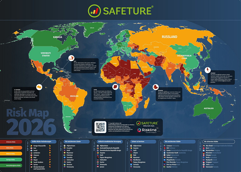 Wo ist das Sicherheitsrisiko besonders hoch? Welche Länder verfügen über keine ausreichende medizinische Versorgung? Wie gefährdet sind Reisende? Welche Städte sind unsicher und welche nicht? Darüber informiert die Risk Map 2026, die Safeture gemeinsam mit seinem Partner Riskline herausgebracht hat.