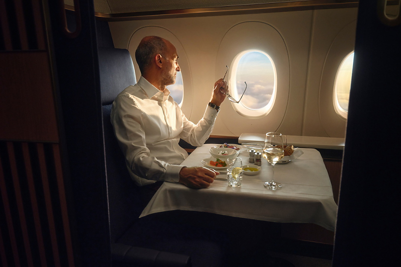 Die Reisenden in der First Class genießen mit FOX eine kuratierte Abfolge kleinerer Gänge, die aus Amouse Bouche, Vorspeise und Dessert bestehen. Beim Hauptgang haben sie die Wahl zwischen einem einzelnen Gericht und einem Degustationsmenü. Zusätzlich kommen die Fluggäste auch weiterhin in den Genuss des beliebten Kaviarservices. Neu werden dabei neben dem erstklassigen Kaviar mit Zitrone, Ei, Schalotte und Crème fraîche auch Blinis gereicht – klassisch auf einem Perlmuttlöffel.